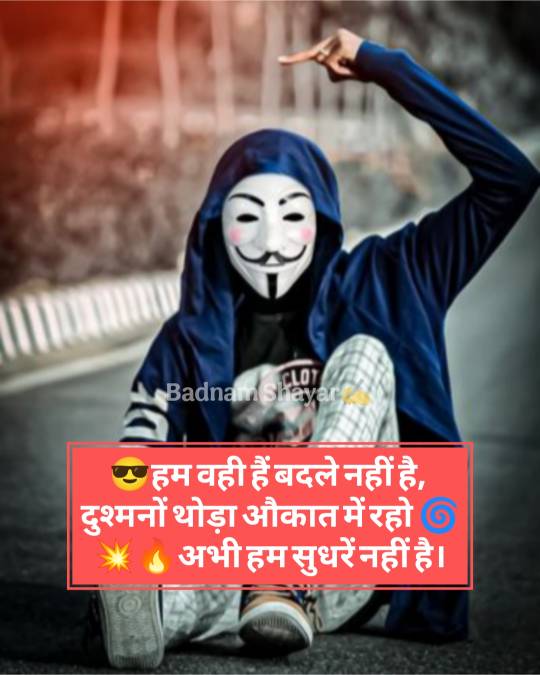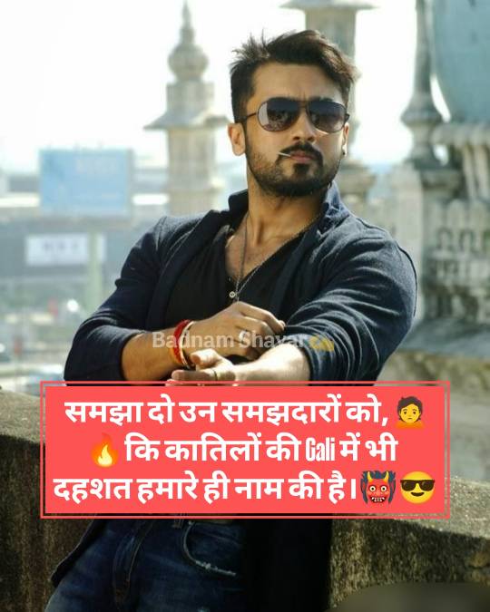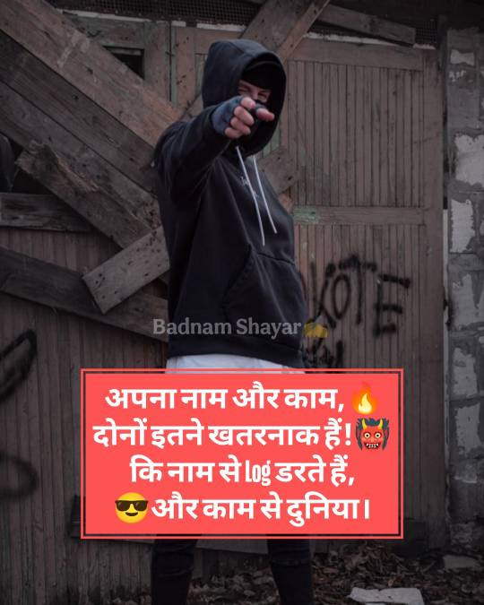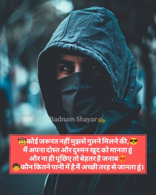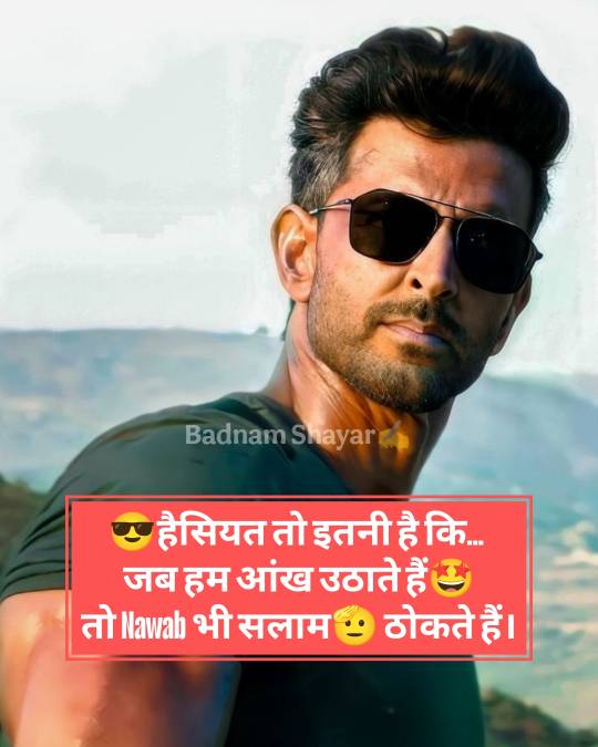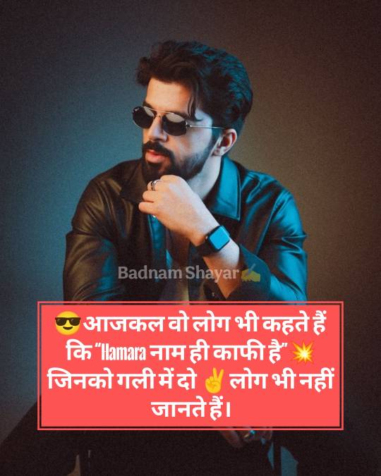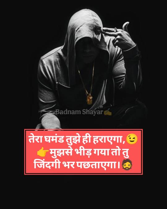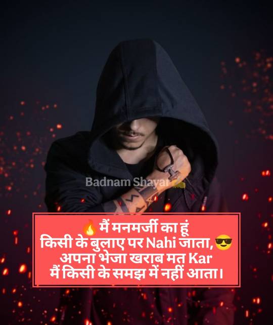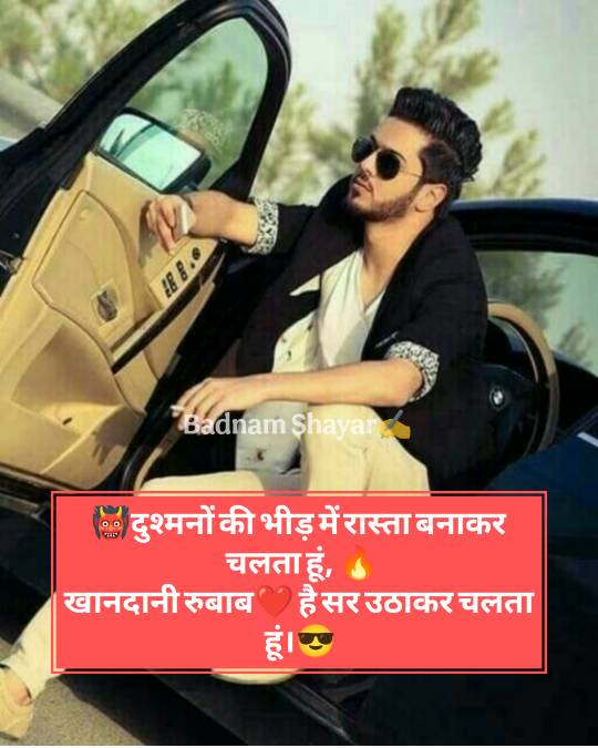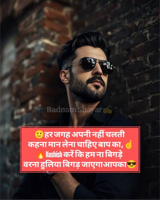 मित्रों मुझे लगता है कि आपको Attitude Shayari In Hindi पढ़ना पसंद है तभी तो आप एटीट्यूड शायरी हिंदी में सर्च करते हुए हमारे इस पोस्ट तक पहुंचे हैं। Attitude एक छोटा सा शब्द है पर वो एक इंसान का आत्मविश्वास और सोच है जो एक शख्स आईना है। जब वही अंदाज एक शायरी के रूप में बयां होता है तो उसे कहा जाता है Attitude Shayari 2 Line अगर आपकी भी पहचान और सोच सबसे अलग सबसे जुदा है, आप भी भीड़ में अपनी पहचान अलग बनाना चाहते हैं तो इस जबरदस्त शायरी एटीट्यूड को जरूर पढ़िए। इस लेख में आपको वो सभी Khatarnak Attitude Shayari पढ़ने को मिलेगी जो आपकी पर्सनेलिटी और आपकी सोच को सबसे अलग बनाती है, आप मे एक आत्मविश्वास पर देती है, और आपके दुश्मनों आपके जज्बे अहसास कराती है। इस Attitude Shayari 😎😎😎 boy को पढ़कर आप में एक जोश एक ऐसा एटीट्यूड ऊभर के आएगा कि आपके दुश्मन भी आपके सामने पीके पड़ जाएंगे। आजकल लोग अपनी बात को दमदार और कड़क अंदाज में कहना पसंद करते हैं। अगर आपको भी अपनी दबंग वाली स्टाइल किसी को दिखाने के लिए या बताने के लिए Attitude Shayari की तलाश है तो आपकी तलाश यहां पूरी हो जाएगी क्योंकि हमने यहां पर Attitude Shayari एक लंबी लिस्ट दी है जिनमें एक से बढ़कर एक एटिट्यूड शायरियां शामिल है। आप अपना दबंग अंदाज को बयां करने के लिए यहां से एक जबरदस्त एटीट्यूड शायरी चुन सकते हैं।